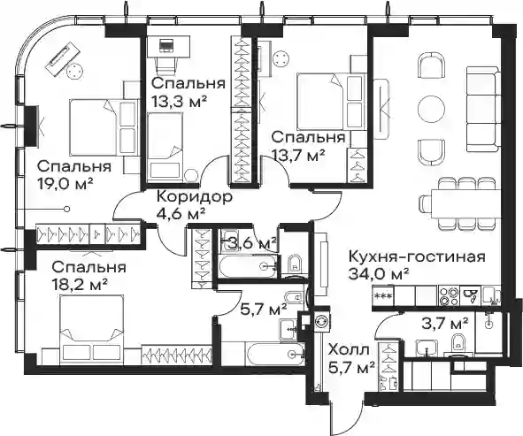 В комплексе предложено множество планировочных решений: в наличии квартиры, как классического типа, так и европланировки. Квартиры сдаются с подчистовой отделкой, высотой потолков 3 м и панорамным остеклением в пол.