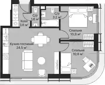 В комплексе предложен широкий выбор планировочных решений: от компактных студий площадью 22 кв. метра до просторных резиденций площадью 120 кв. метров. Планировками предусмотрены мастер-спальни с гардеробной и санузлом, просторные кухни-гостиные, гардеробные и системы хранения, выделенные рабочие зоны в спальнях и террасы с панорамным видом на город. Во всех квартирах панорамные окна и высокие потолки от 2,85 метра. Квартиры сдаются с отделкой White box.