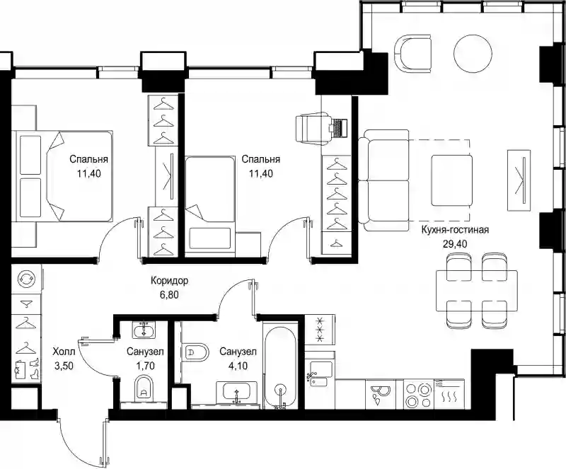 В проекте предложен широкий выбор планировочных решений от студий до 4-комнатных квартир. Есть лоты с кухнями-гостиными, мастер-спальнями, террасами, эркерами, лоджиями и балконами. Все квартиры представлены в подчистовой отделке White box по стандарту MR Base. Из панорамных окон открывается вид на парк и набережную Сходненского канала.