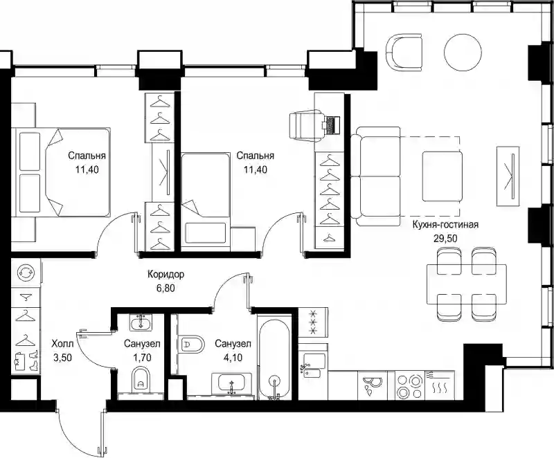 В проекте предложен широкий выбор планировочных решений от студий до 4-комнатных квартир. Есть лоты с кухнями-гостиными, мастер-спальнями, террасами, эркерами, лоджиями и балконами. Все квартиры представлены в подчистовой отделке White box по стандарту MR Base. Из панорамных окон открывается вид на парк и набережную Сходненского канала.