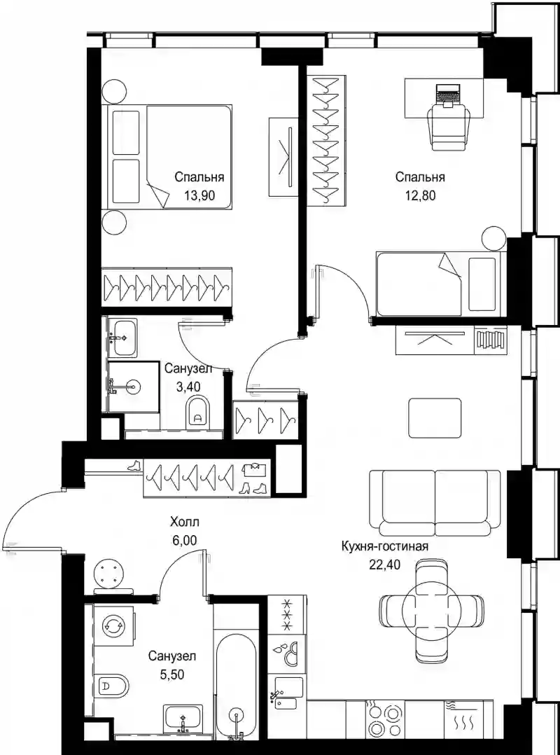 В проекте предложен широкий выбор планировочных решений от студий до 4-комнатных квартир. Есть лоты с кухнями-гостиными, мастер-спальнями, террасами, эркерами, лоджиями и балконами. Все квартиры представлены в подчистовой отделке White box по стандарту MR Base. Из панорамных окон открывается вид на парк и набережную Сходненского канала.