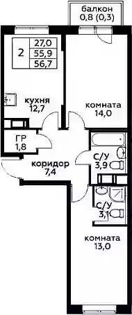 13 468 561 ₽2-к.квартира, 55.9 м², 14 эт.