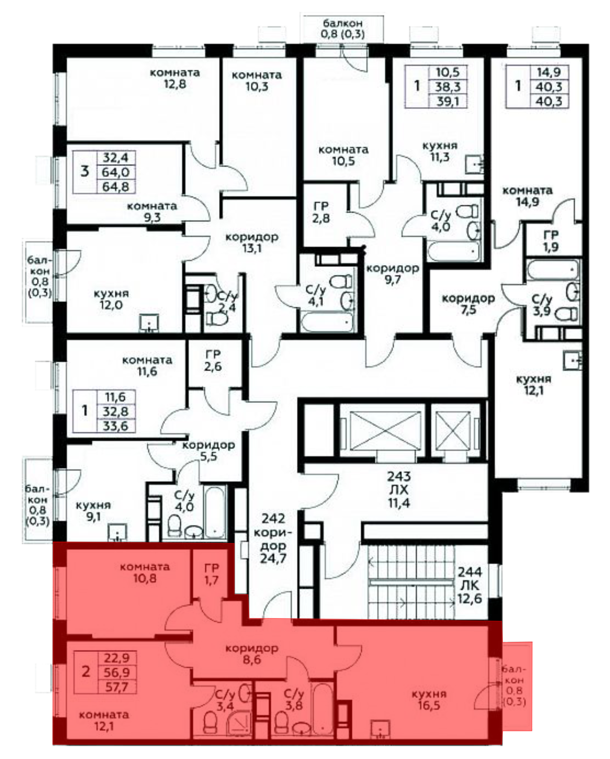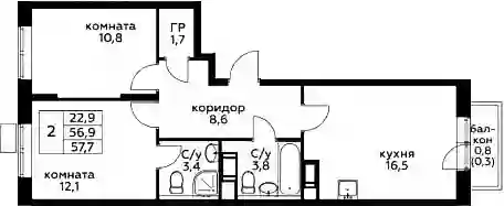 16 554 943 ₽2-к.квартира, 56.9 м², 3 эт.