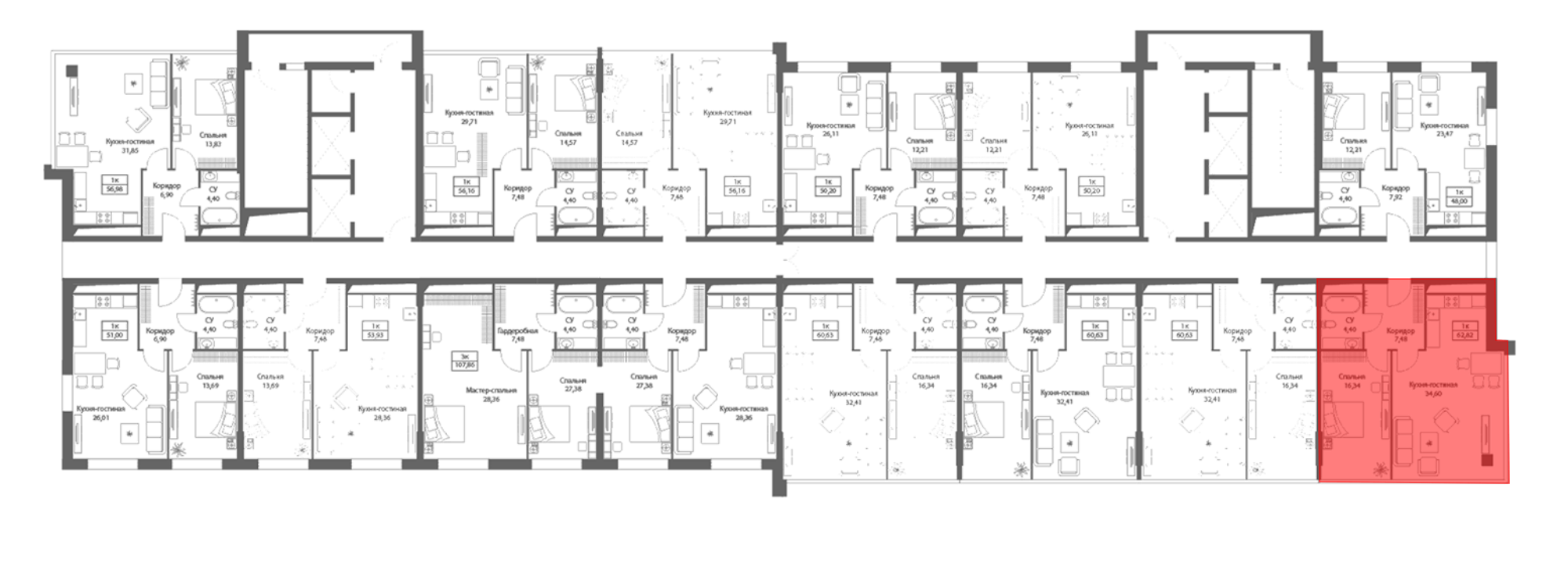 В жилой части комплекса представлены резиденции различного метража и планировок. Квартиры предлагаются с подчистовой отделкой, увеличенными или панорамными окнами и высотой потолков от 3,15 метров.