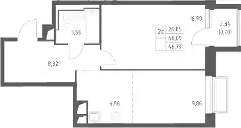 16 289 347 ₽2-к.квартира, 46.09 м², 2 эт.
