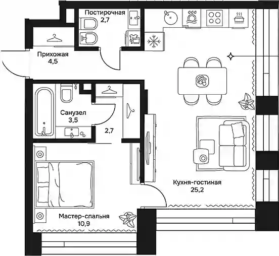 В проекте представлен широкий выбор планировок квартир евро-формата. Площадь квартир варьируется от 31 до 177 кв. метров. В каждой квартире есть просторная кухня-гостиная, продуманная мастер-спальня, вместительная гардеробная, гостевой санузел и постирочная. Предусмотрены квартиры с возможностью объединения, а также ориентированные на две стороны света. На верхних этажах расположены 5 пентхаусов с террасами. В них высота потолков составляет 4,1 метра, а на типовых этажах — 3,25 метра.Квартиры предлагаются с двумя вариантами отделки: White Box и дизайнерской чистовой отделкой. Пентхаусы сдаются без отделки.