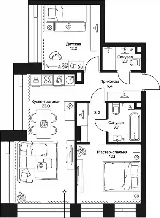 В проекте представлен широкий выбор планировок квартир евро-формата. Площадь квартир варьируется от 31 до 177 кв. метров. В каждой квартире есть просторная кухня-гостиная, продуманная мастер-спальня, вместительная гардеробная, гостевой санузел и постирочная. Предусмотрены квартиры с возможностью объединения, а также ориентированные на две стороны света. На верхних этажах расположены 5 пентхаусов с террасами. В них высота потолков составляет 4,1 метра, а на типовых этажах — 3,25 метра.Квартиры предлагаются с двумя вариантами отделки: White Box и дизайнерской чистовой отделкой. Пентхаусы сдаются без отделки.