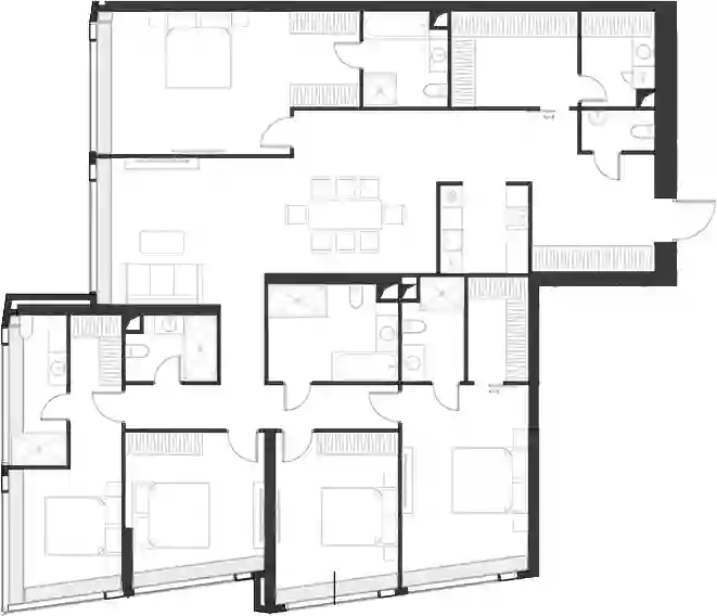 В жилом комплексе «Дом Дау» представлено множество планировочных решений — от 1-комнатных до 5-комнатных квартир, среди которых квартиры с террасами и дровяными каминами. Высота потолков с 79 по 81 этаж составляет 3,8 метров, а на остальных этажах — 3,23 метра.