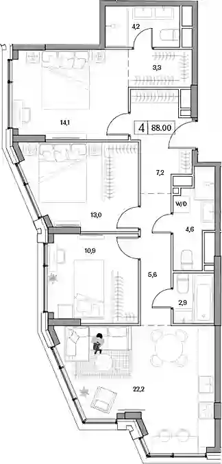 В жилом комплексе представлен широкий выбор планировочных решений: от уютных студий до просторных 4-х комнатных квартир европейского формата. Площадь квартир варьируется от 28 до 88 квадратных метров. В квартирах предусмотрены ниши для шкафов и гардеробных, а также кухни-гостиные и мастер-спальни с отдельной гардеробной комнатой и санузлом. На верхних этажах находятся видовые пентхаусы площадью от 121 до 297 кв. метров с собственными террасами. Квартиры сдаются без отделки и внутренних перегородок. В каждой квартире высокие потолки и панорамное остекление. Из 95% квартир открывается вид на Москву-реку.
