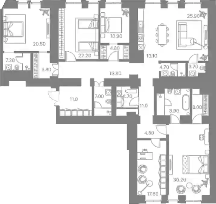 В проекте представлено множество планировочных решений — от 1-комнатных до 5-ти комнатных квартир, в том числе и пентхаусов с террасами и бассейном.