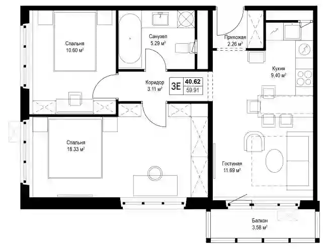 3-к.квартира, 58.84 м², 8 эт. в ЖК Эко Видное 2.0 Корпус 4 Нестеров