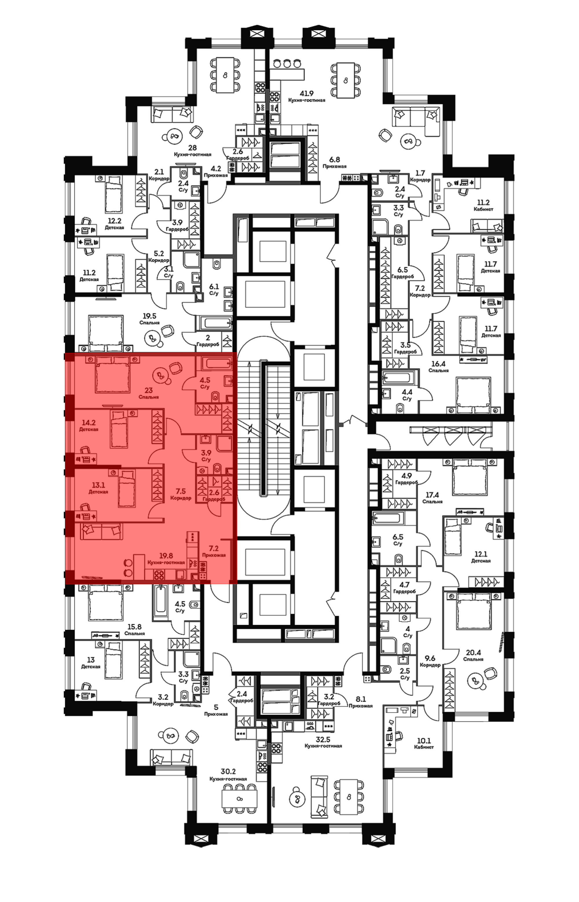 В проекте представлено множество планировочных решений — от студий до 5-комнатных квартир, среди которых квартиры Top Floor. Все лоты сдаются с базовой отделкой, увеличенными или панорамными окнами и высотой потолков до 4,1 метров.