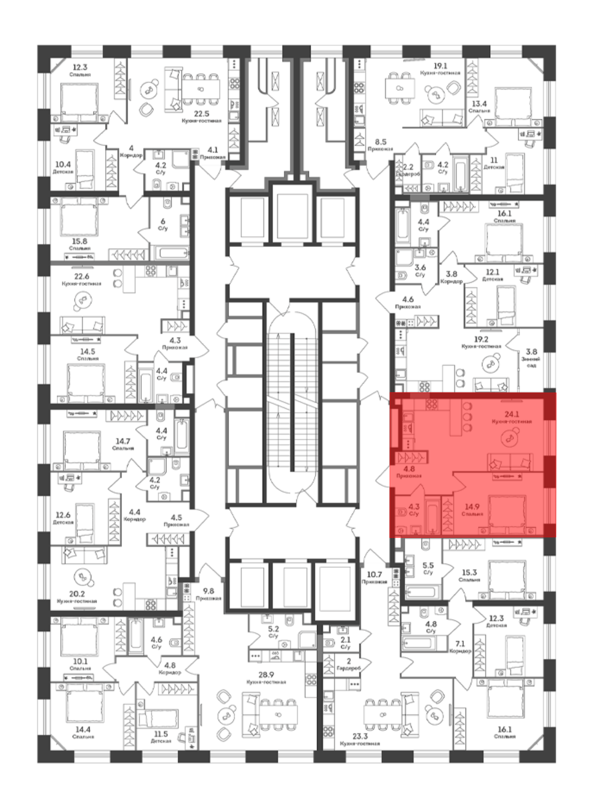 В проекте представлено множество планировочных решений — от студий до 5-комнатных квартир, среди которых квартиры Top Floor. Все лоты сдаются с базовой отделкой, увеличенными или панорамными окнами и высотой потолков до 4,1 метров.