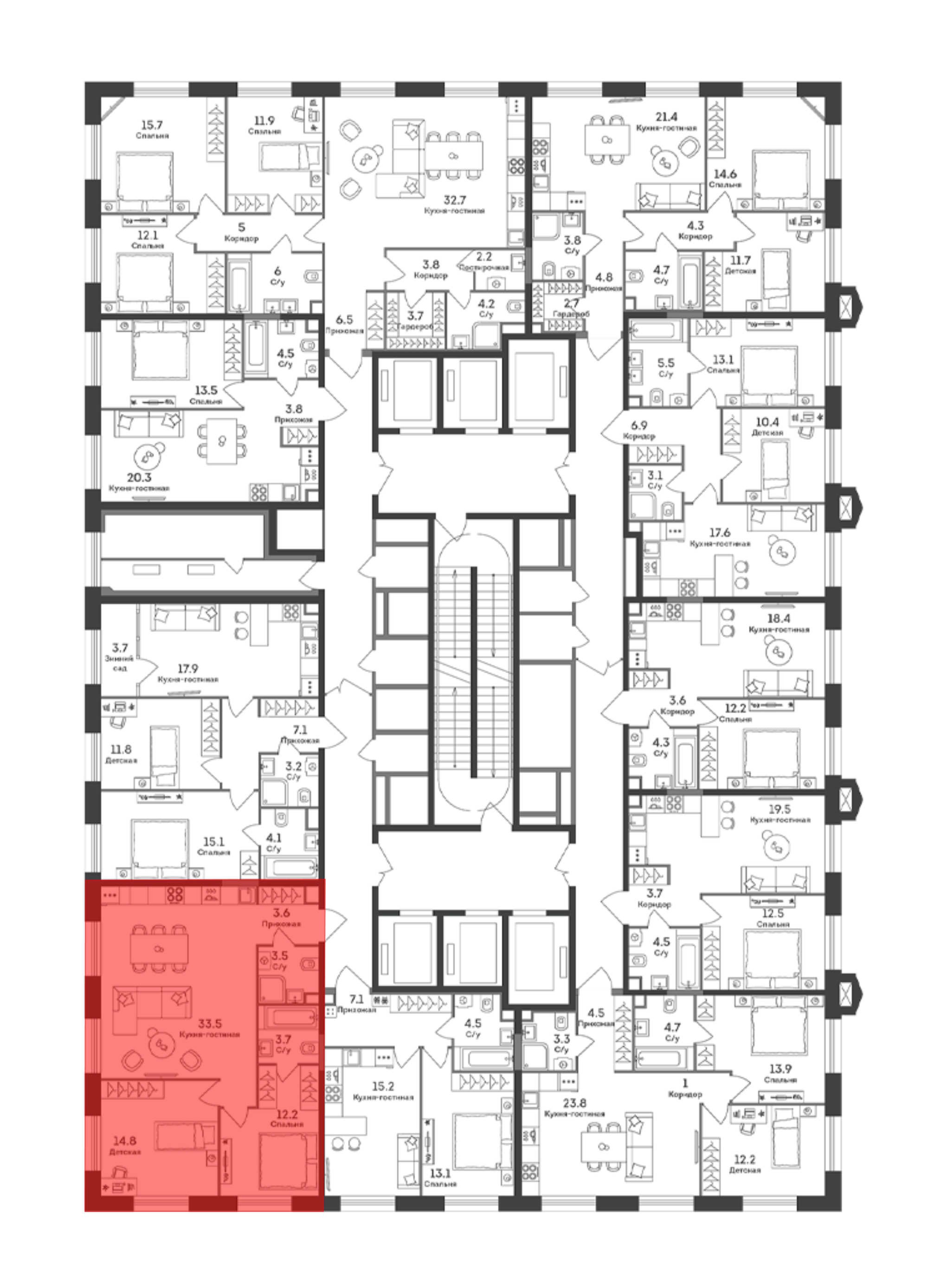 В проекте представлено множество планировочных решений — от студий до 5-комнатных квартир, среди которых квартиры Top Floor. Все лоты сдаются с базовой отделкой, увеличенными или панорамными окнами и высотой потолков до 4,1 метров.