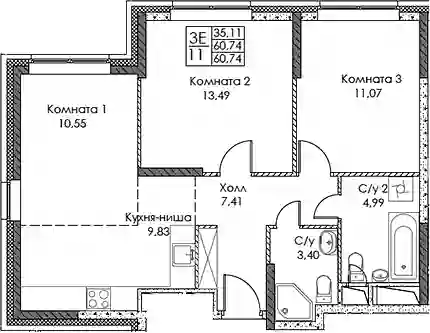 3-к.квартира, 60.74 м², 3 эт. в ЖК EVOPARK Сокольники Корпус 1