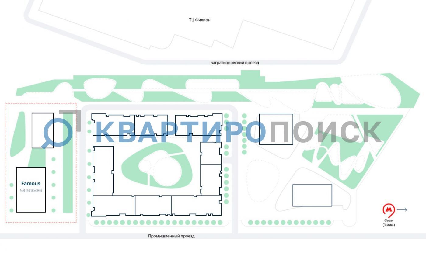 Проект «Famous» находится в районе Филёвский парк. Этот район является одним из старейших в составе Москвы. Развитая инфраструктура, хорошая экология, памятники архитектуры и близость к Москве-реке. В пешей доступности три станции метро: «Парк Победы», «Фили», «Багратионовская». В 10 минутах пешком находится парк Фили и набережная.