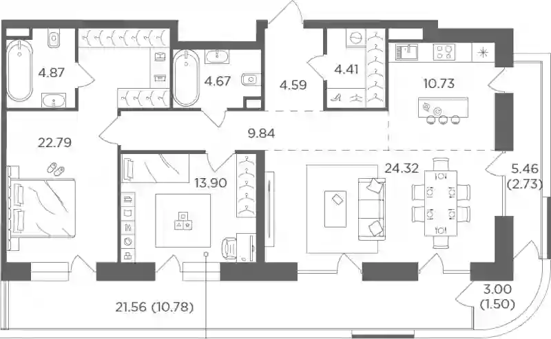 В проекте представлено множество планировочных решений — от студий до просторных 4х-комнатных квартир. Все лоты сдаются с базовой отделкой, высотой потолков до 3,16 метров и стандартными окнами. Предусмотрены квартиры с мастер-спальнями и гардеробными.