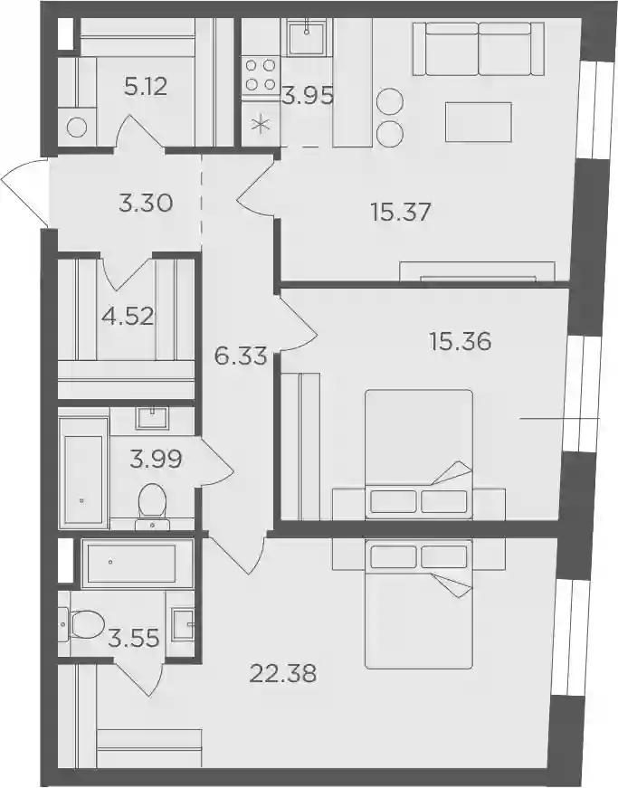 В проекте представлено множество планировочных решений — все лоты сдаются с увеличенными или панорамными окнами, высотой потолков до 3,85 метров и базовой отделкой. Имеются петхаусы с приватными террасами.