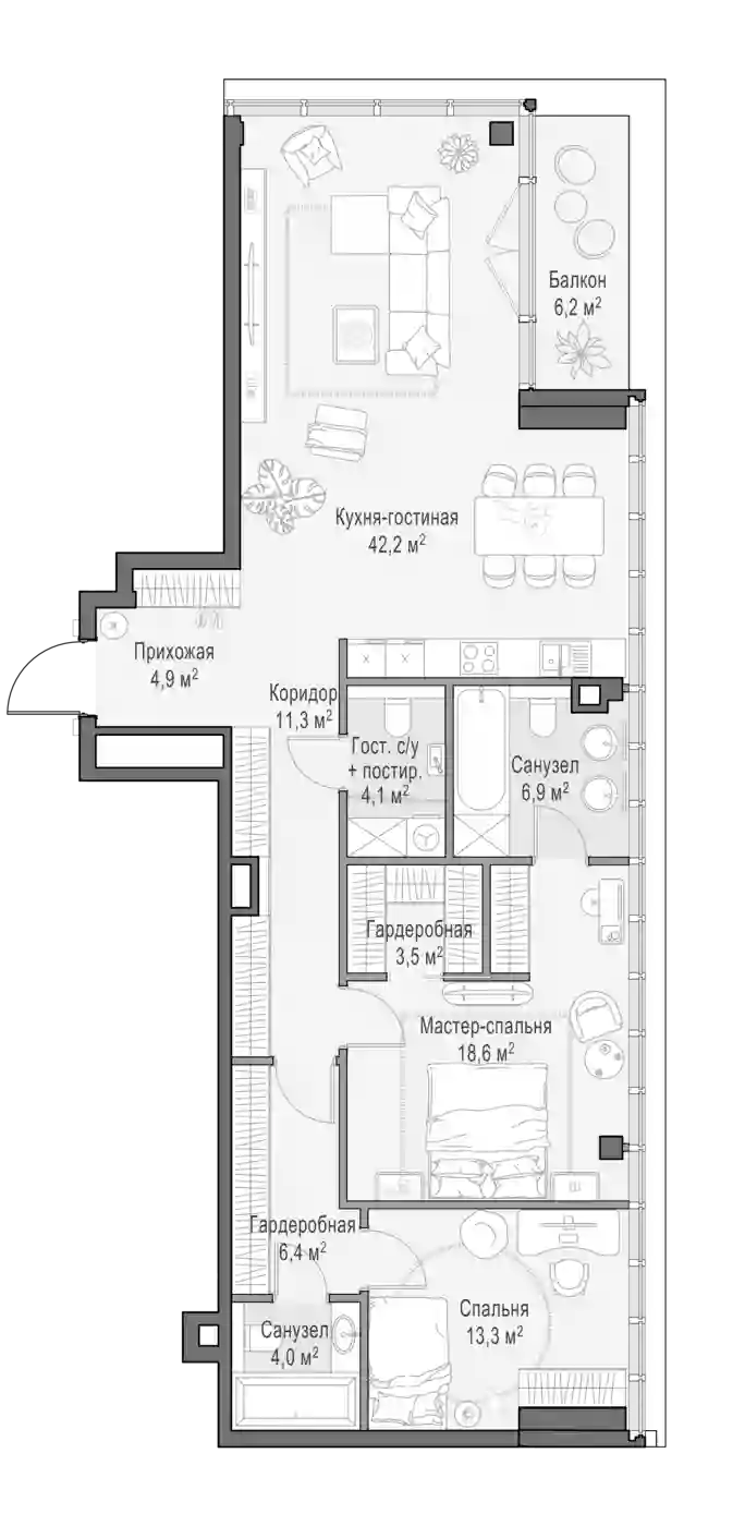 В проекте представлено более 150 планировочных решений. Большой выбор уникальных лотов с бассейнами, видовыми террасами, патио и возможностью обустройства дровяных каминов, а также редких форматов: квартир с потолками высотой 7 метров и антресолями, двухэтажных ситихаусов, пентхаусов и вилл. В домах размещено всего от 2 до 5 лотов на этаже. Из окон квартир открываются живописные виды на Кремль, Москву-реку, Нескучный сад и Парк Горького. О жителях и доме заботится служба комфорта Smineх, которая предлагает сервис уровня 5-звездочных отелей.