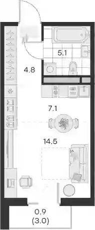 В проекте представлены студии и квартиры с 1–3 комнатами, включая варианты с патио на первом этаже. Высота потолков составляет 3,04 м. Все квартиры оснащены стандартными окнами, а в планировках с обычными или французскими балконами предусмотрены панорамные окна. Жилье передается без стен.