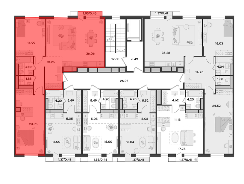 В проекте представлено более 23 видов планировок — от компактных студий до просторных квартир евроформата. Квартиры сдаются с чистовой, предчистовой отделкой и без отделки. Квартиры на первых этажах запроектированы с крытыми террасами, на последних — с французскими балконами и вторым светом. Также представлены квартиры с антресольным этажом и выходом на кровлю.