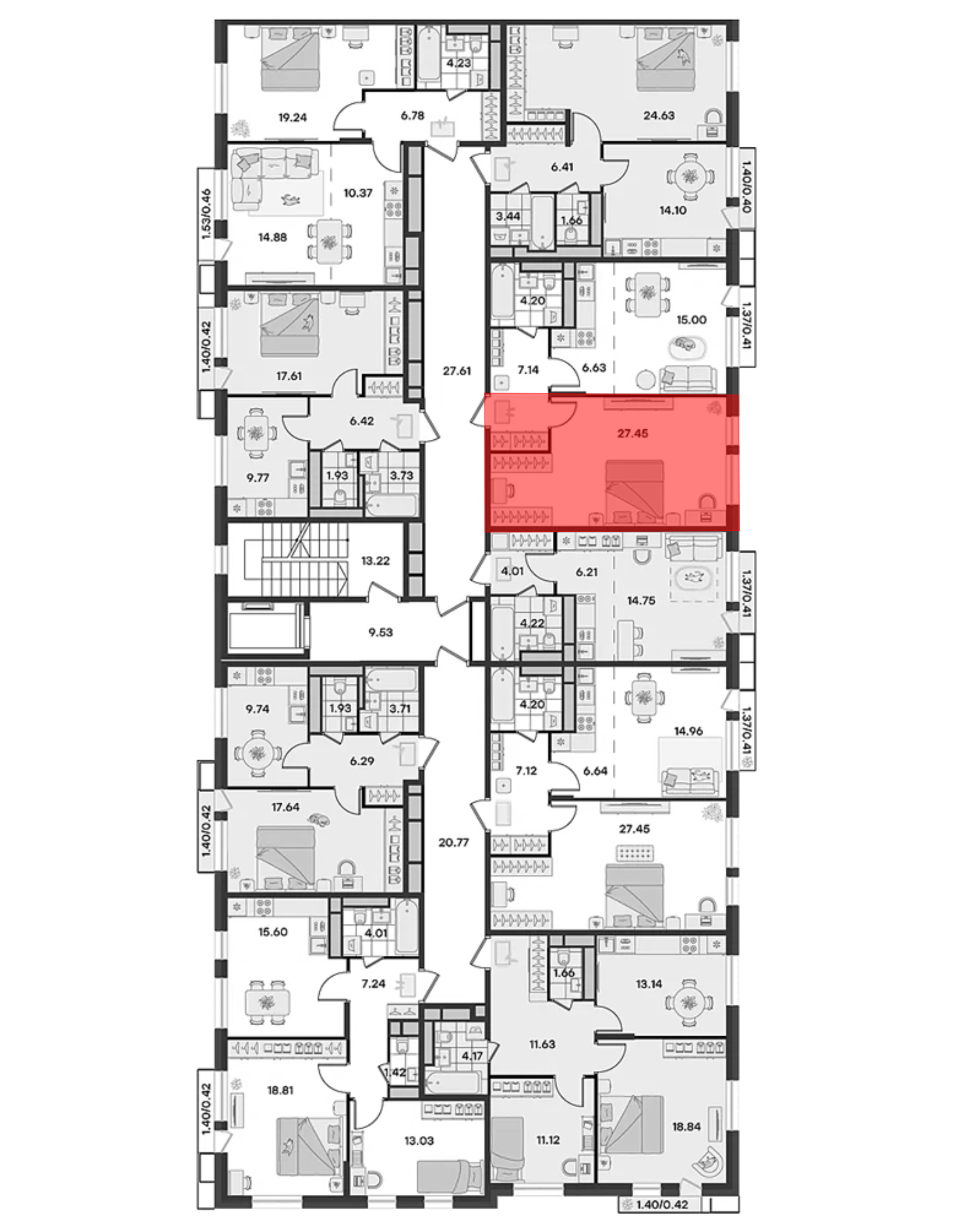 В проекте представлено более 23 видов планировок — от компактных студий до просторных квартир евроформата. Квартиры сдаются с чистовой, предчистовой отделкой и без отделки. Квартиры на первых этажах запроектированы с крытыми террасами, на последних — с французскими балконами и вторым светом. Также представлены квартиры с антресольным этажом и выходом на кровлю.