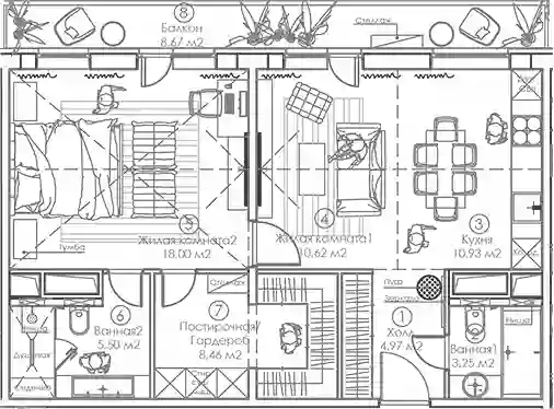 В жилом комплексе представлен широкий выбор планировочных решений: от студий до 3-х комнатных квартир. Также есть квартиры евроформата с кухней-гостиной и варианты с мастер-спальней. Высота потолков составляет 2,8 метра. Все квартиры сдаются без отделки, но есть возможность заказать как подчистовую, так и чистовую отделку.