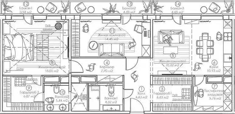 В жилом комплексе представлен широкий выбор планировочных решений: от студий до 3-х комнатных квартир. Также есть квартиры евроформата с кухней-гостиной и варианты с мастер-спальней. Высота потолков составляет 2,8 метра. Все квартиры сдаются без отделки, но есть возможность заказать как подчистовую, так и чистовую отделку.