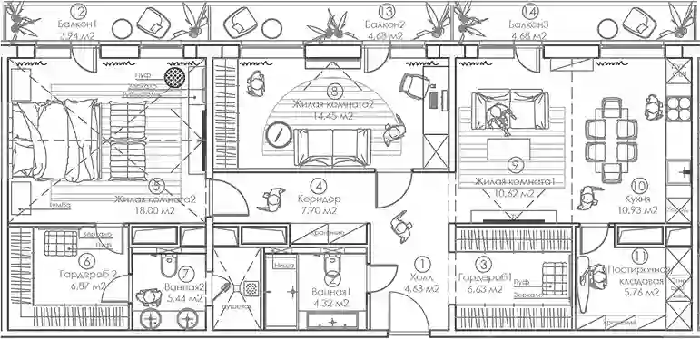 В жилом комплексе представлен широкий выбор планировочных решений: от студий до 3-х комнатных квартир. Также есть квартиры евроформата с кухней-гостиной и варианты с мастер-спальней. Высота потолков составляет 2,8 метра. Все квартиры сдаются без отделки, но есть возможность заказать как подчистовую, так и чистовую отделку.