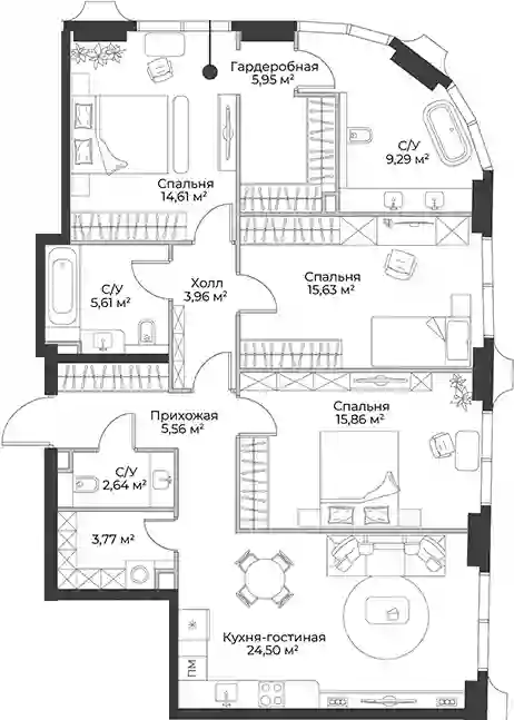 В проекте представлены квартиры площадью 39–300 кв. м с 1–4 комнатами и 18 типами планировок, включая форматы с ванными комнатами с панорамным остеклением, каминами и кухнями с кладовыми. Высота потолков варьируется от 3,2 до 5 м. В каждой квартире предусмотрена центральная система кондиционирования VRF. На 27 этаже спроектировано 3 пентхауса площадью 250, 290 и 300 кв. м с дровяными каминами и отдельными входами для жильцов и персонала.