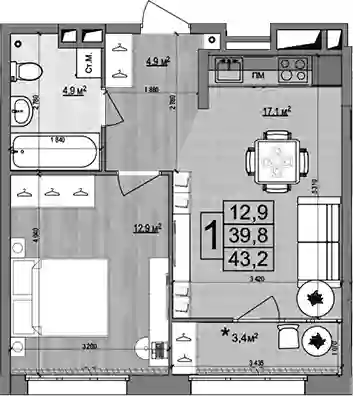 7 154 600 ₽2-к.квартира, 43.1 м², 3 эт.