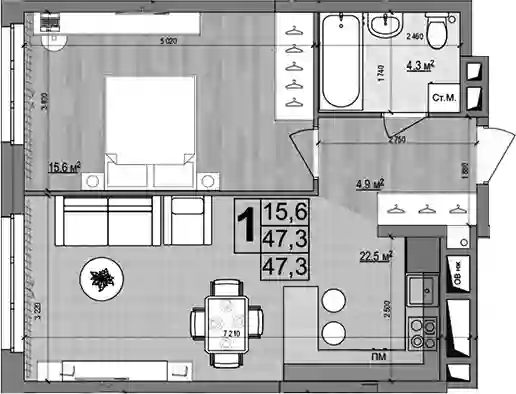 1 ₽2-к.квартира, 43.1 м², 5 эт.