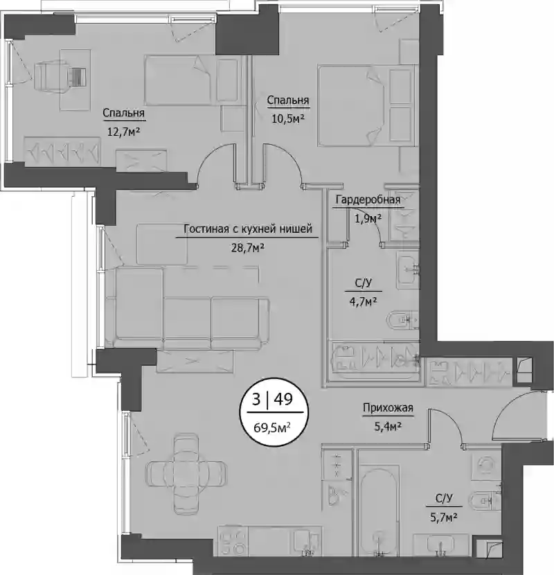 3-к.квартира, 69.7 м², 8 эт. в ЖК Hide Корпус RiverSide