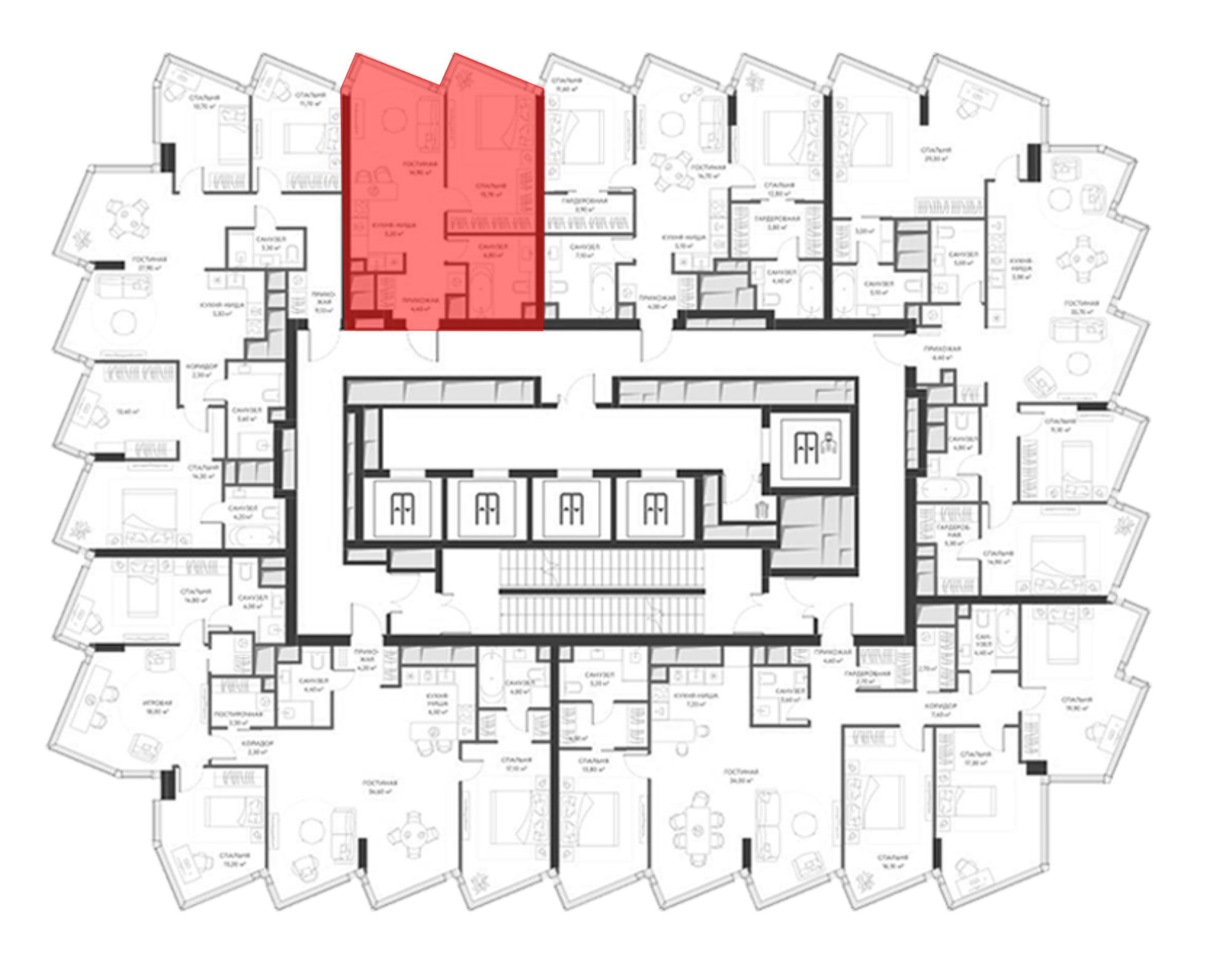 В комплексе представлены квартиры с одной, двумя, тремя и четырьмя спальнями, площадь которых варьируется от 35,5 до 280 квадратных метров. Также есть уникальные форматы: квартиры с террасами, двухуровневые квартиры с патио, «парящие» квартиры и пентхаусы. Все квартиры сдаются с отделкой White box, а высота потолков составляет от 3,25 до 6,35 метра.