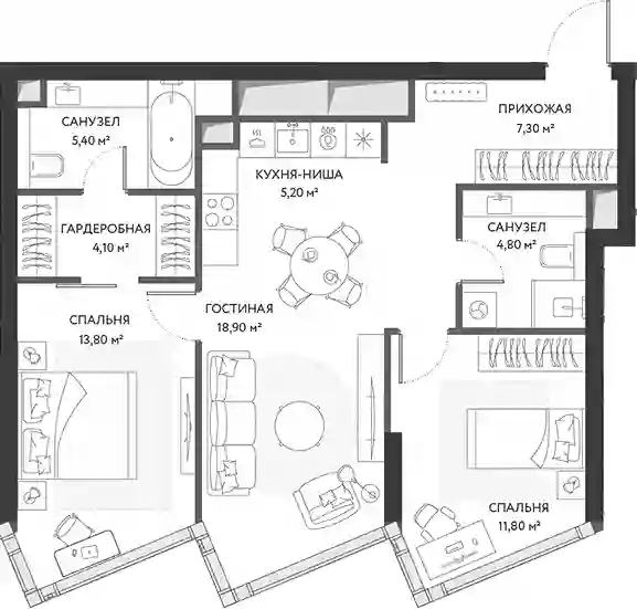В комплексе представлены квартиры с одной, двумя, тремя и четырьмя спальнями, площадь которых варьируется от 35,5 до 280 квадратных метров. Также есть уникальные форматы: квартиры с террасами, двухуровневые квартиры с патио, «парящие» квартиры и пентхаусы. Все квартиры сдаются с отделкой White box, а высота потолков составляет от 3,25 до 6,35 метра.