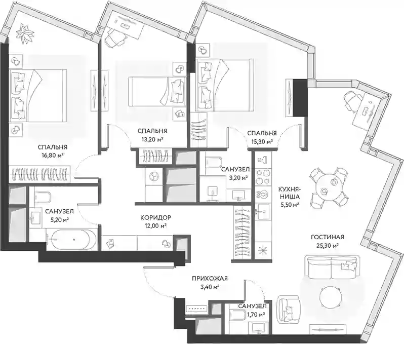 В комплексе представлены квартиры с одной, двумя, тремя и четырьмя спальнями, площадь которых варьируется от 35,5 до 280 квадратных метров. Также есть уникальные форматы: квартиры с террасами, двухуровневые квартиры с патио, «парящие» квартиры и пентхаусы. Все квартиры сдаются с отделкой White box, а высота потолков составляет от 3,25 до 6,35 метра.