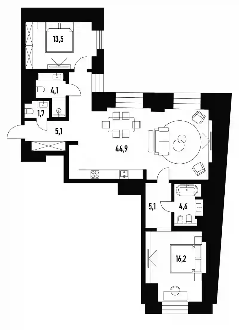 В комплексе предлагается всего 13 квартир с 2–4 комнатами площадью от 105 до 363 кв. м. Высота потолков в помещениях составляет 3,4 м, установлены увеличенные окна, в отдельных планировках есть эркеры. Квартиры идут в 2 вариантах отделки: без стен и чистовая. В чистовом исполнении используются натуральные материалы: дерево, камень, агломерат, влагостойкая краска, встроенное освещение, лепной карниз. Предусмотрены кухня с техникой, видеодомофон, сантехника от брендов Dornbracht и Villeroy & Boch, а также индивидуальный климат-контроль в каждой комнате.