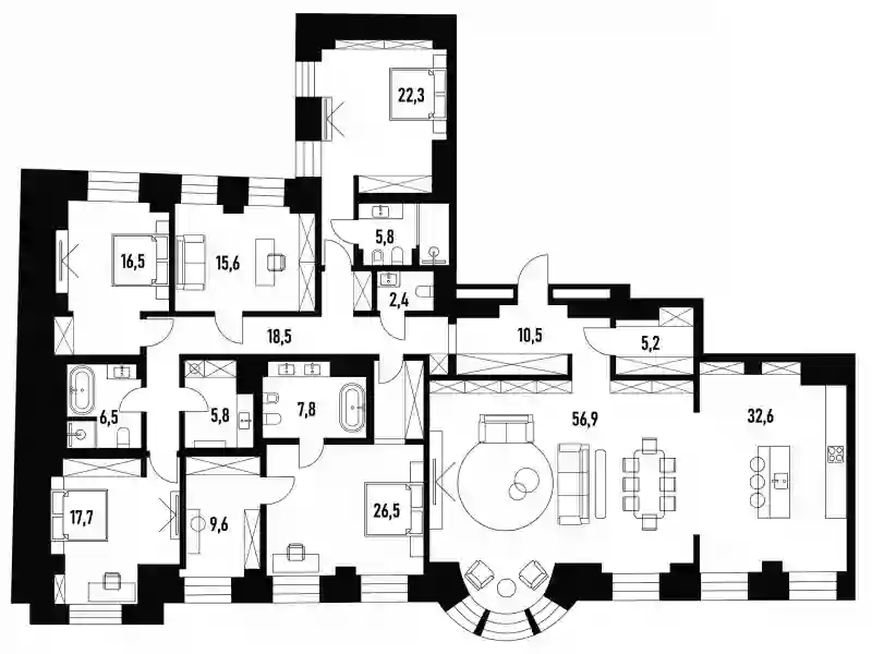 В комплексе предлагается всего 13 квартир с 2–4 комнатами площадью от 105 до 363 кв. м. Высота потолков в помещениях составляет 3,4 м, установлены увеличенные окна, в отдельных планировках есть эркеры. Квартиры идут в 2 вариантах отделки: без стен и чистовая. В чистовом исполнении используются натуральные материалы: дерево, камень, агломерат, влагостойкая краска, встроенное освещение, лепной карниз. Предусмотрены кухня с техникой, видеодомофон, сантехника от брендов Dornbracht и Villeroy & Boch, а также индивидуальный климат-контроль в каждой комнате.