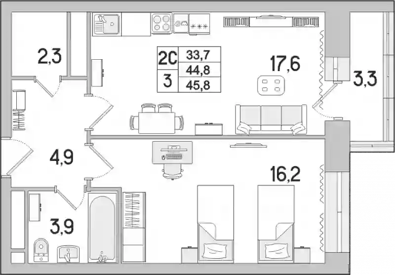 8 862 300 ₽2-к.квартира, 44.8 м², 13 эт.