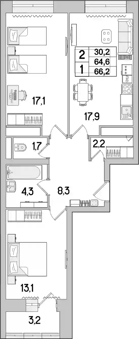 13 604 100 ₽3-к.квартира, 64.6 м², 17 эт.