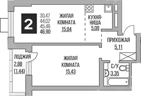 2-к.квартира, 44.02 м², 13 эт. в ЖК Ильинойс Корпус 3