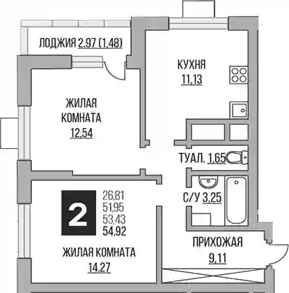 13 696 289 ₽3-к.квартира, 54.02 м², 2 эт.