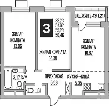 16 714 564 ₽3-к.квартира, 52.43 м², 28 эт.