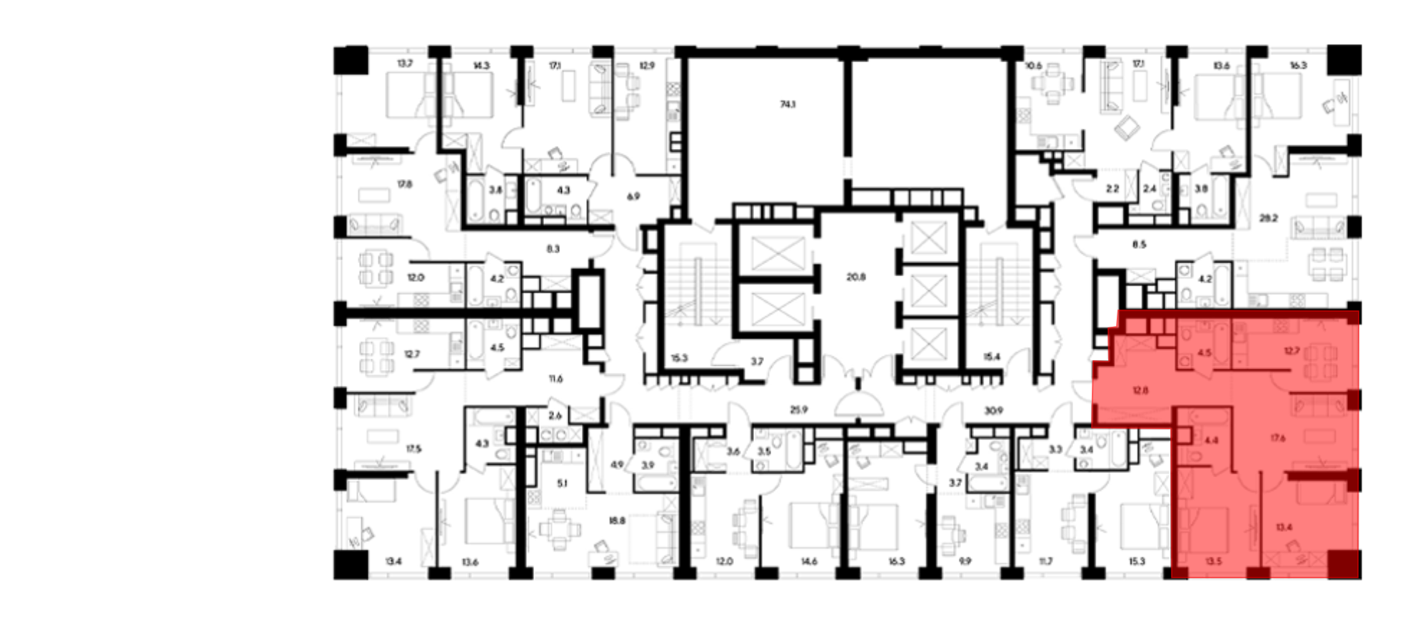В проекте представлено множество планировочных решений — от студий до просторных 3х-комнатных квартир. Все лоты сдаются с подчистовой отделкой, высотой потолков до 3,5 метров и панорамными окнами.