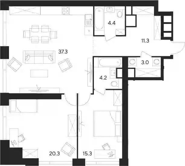 В проекте представлено множество планировочных решений — от студий до просторных 3х-комнатных квартир. Все лоты сдаются с подчистовой отделкой, высотой потолков до 3,5 метров и панорамными окнами.