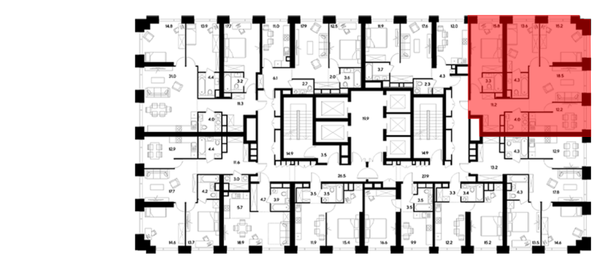 В проекте представлено множество планировочных решений — от студий до просторных 3х-комнатных квартир. Все лоты сдаются с подчистовой отделкой, высотой потолков до 3,5 метров и панорамными окнами.