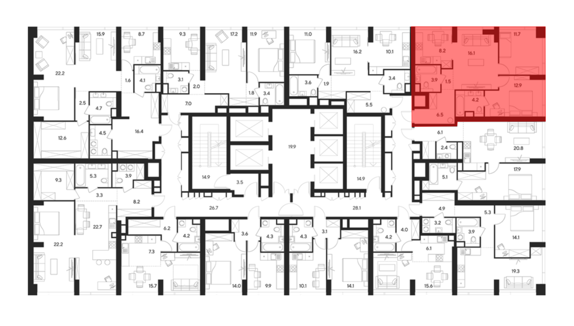 В проекте представлено множество планировочных решений — от студий до просторных 3х-комнатных квартир. Все лоты сдаются с подчистовой отделкой, высотой потолков до 3,5 метров и панорамными окнами.