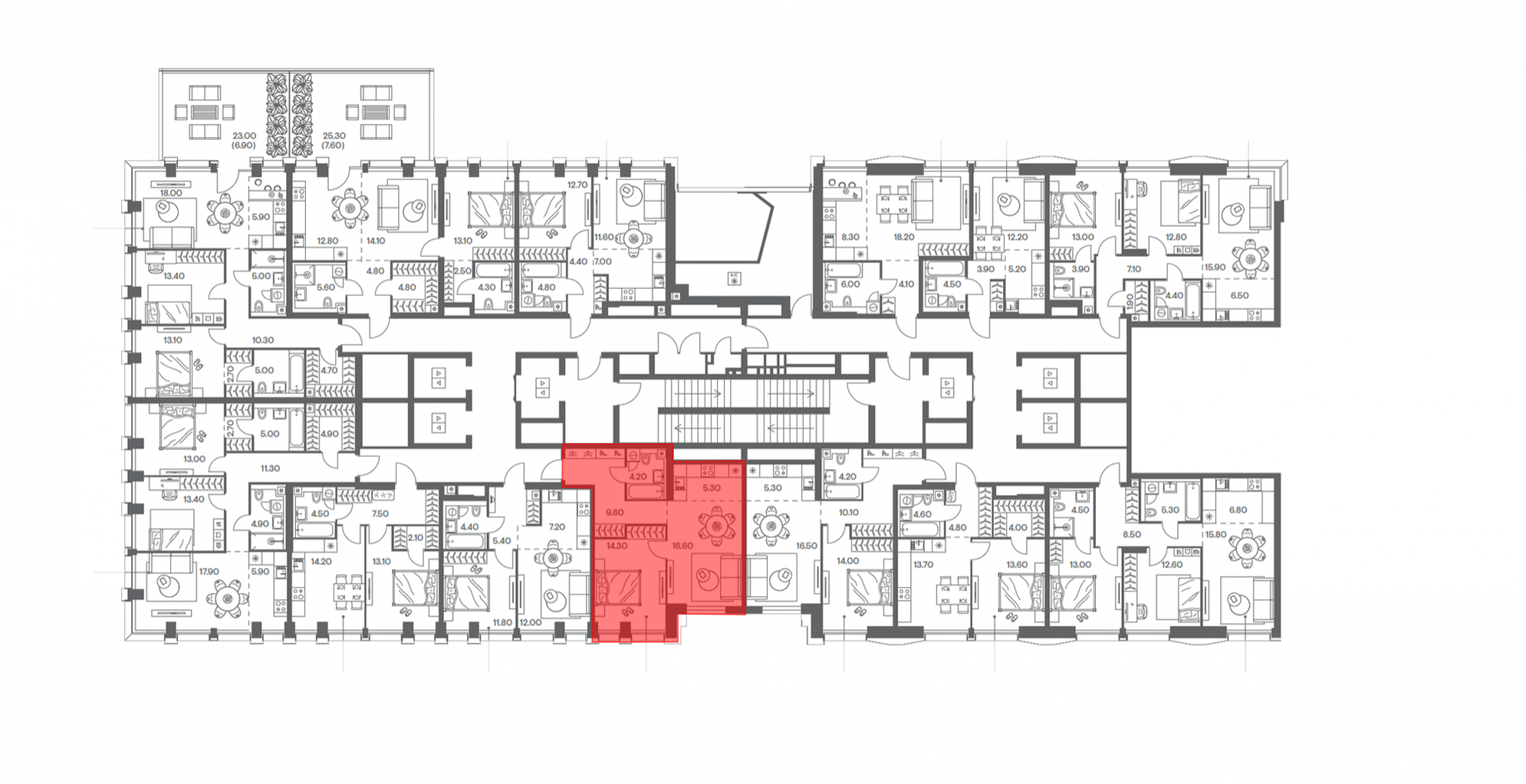 В проекте представлено множество планировочных решений — все лоты сдаются с увеличенными или панорамными окнами, высотой потолков до 3,85 метров и базовой отделкой. Имеются петхаусы с приватными террасами.
