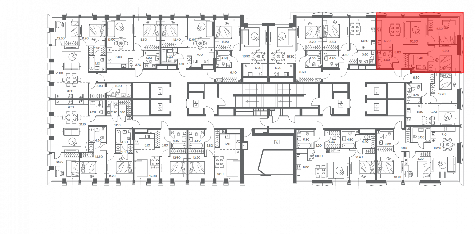 В проекте представлено множество планировочных решений — все лоты сдаются с увеличенными или панорамными окнами, высотой потолков до 3,85 метров и базовой отделкой. Имеются петхаусы с приватными террасами.