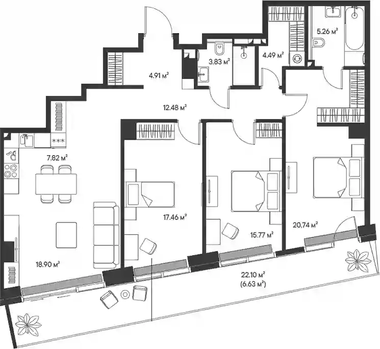43 855 383 ₽3-к.квартира, 74.47 м², 42 эт.